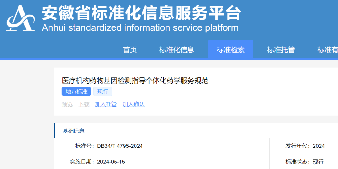近日,由安徽省市場監督管理局批準發布的《醫療機構藥物基因檢測指導個體化藥學服務規范》(下文稱“該標準”)已正式生效實施。該標準由中國科學技術大學附屬第一醫院(安徽省立醫院)提出并牽頭起草,安徽省第二人民醫院、安徽醫科大學第一附屬醫院、西安天隆科技有限公司、安徽康澤生物技術有限公司等單位參與起草,其中,中國科學技術大學附屬第一醫院(安徽省立醫院)藥學部史天陸主任藥師為該標準牽頭起草人。