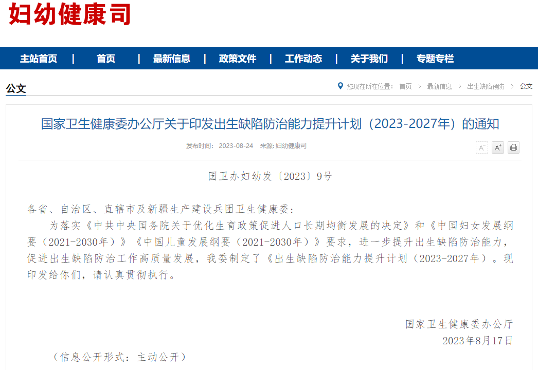 國家衛生健康委發布《關于印發出生缺陷防治能力提升計劃(2023-2027年)的通知》(以下簡稱《計劃》),旨在進一步提升出生缺陷防治能力,促進出生缺陷防治工作高質量發展。